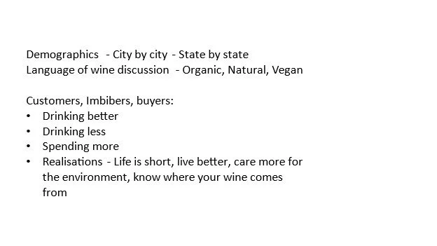 Well, I refer you back to the slide showing the static noise of the industry, it is hard to navigate through, there is no easy pathway, each state, town, suburb and dining or retail space is different and can attract a different set of customers, in bubbles or not. It is hard to know what might be on the horizon as the world grapples with the next set of tipping points in the industry. From buyer behavior to the next generation of well-informed beverage buyers, again - not just wine; Sustainability, Climate and how Organic or terms related to Organic have meaning.