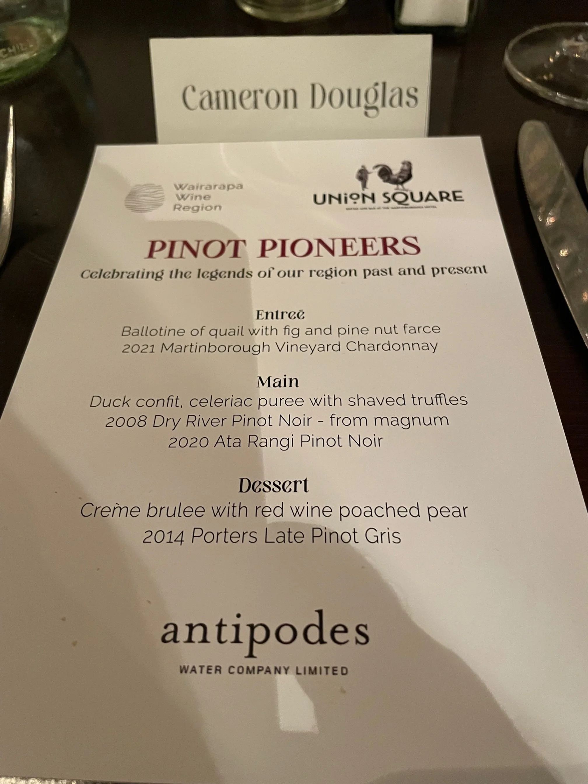 We had a delicious lunch at Poppies, a fabulous cuppa and muffin at Big Sky wines and a fabulous dinner at the Martinborough hotel recognising Pinot Pioneers - Neill and Dawn McCallum, Clive Paton and Phyll Pattie, Larry and Sue McKenna and Derek Milne (DSIr Soil Scientist).