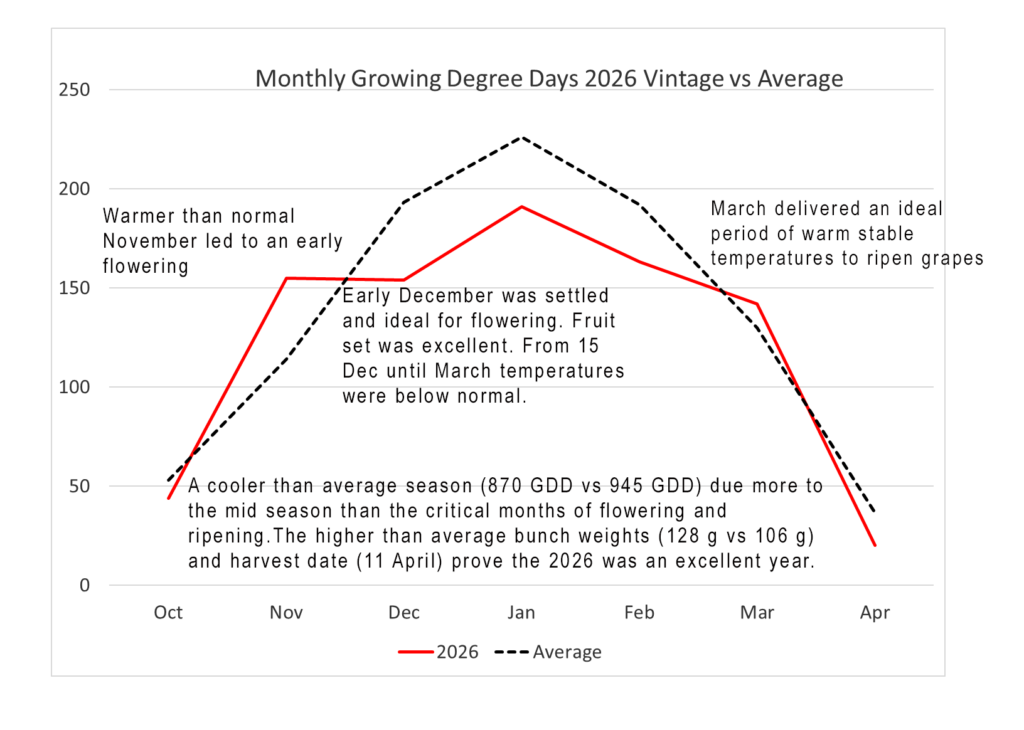 The 2026 vintage was defined by a cool, extended growing season that allowed for slow, even ripening and exceptional flavour development. Following a frosty start to spring, warming conditions and steady rainfall supported a healthy and balanced start to the season. Flowering in early December was even across the vineyard, setting the foundation for consistent yields. While the season brought persistent winds and cooler temperatures, these conditions naturally moderated vine growth, maintaining open canopies and low disease pressure.
